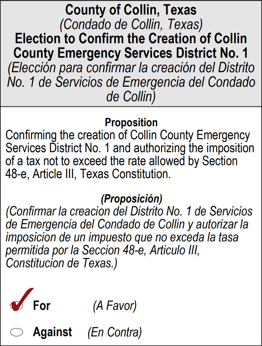 Parts of Collin County are at risk of losing local fire and EMS services following the termination of several key county contracts. Your Vote For Collin County Emergency Services District No. 1 ensures you have access to emergency services when you need them most.